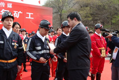 “我們倡議:把不斷學(xué)習(xí)作為一種精神追求,把不斷創(chuàng)新作為一個(gè)奮斗目標(biāo),把勤儉節(jié)約作為一種生活習(xí)慣,把安全生產(chǎn)作為一種自覺行為,把關(guān)愛生命作為一種社會(huì)責(zé)任……”4月22日,主題為“見證?長(zhǎng)城?礦工”的頒牌活動(dòng)在八達(dá)嶺水關(guān)長(zhǎng)城舉行,與會(huì)領(lǐng)導(dǎo)為獲獎(jiǎng)礦工頒獎(jiǎng),獲獎(jiǎng)礦工代表宣讀了倡議書。4月23日清晨,百名優(yōu)秀青年礦工在天安門廣場(chǎng)觀看了升旗儀式,并進(jìn)行了宣誓。隨后,在人民大會(huì)堂舉行百名優(yōu)秀青年礦工群雕式新聞發(fā)布儀式。“這是光榮與夢(mèng)想的交響,這是570萬礦工的驕傲”,當(dāng)人民大會(huì)堂新聞發(fā)布廳雄渾的音樂響起,燈光漸暗,礦燈齊明,礦工們閃耀亮相。