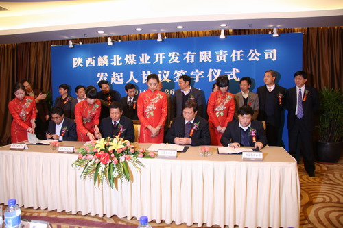 11月26日下午,陜西麟北煤業(yè)開(kāi)發(fā)有限責(zé)任公司發(fā)起人協(xié)議簽字儀式在西安索菲特人民大廈會(huì)展中心舉行。省國(guó)資委副主任王浩生,寶雞市政府常務(wù)副市長(zhǎng)上官吉慶,陜西省投資集團(tuán)黨委書(shū)記、董事長(zhǎng)梁平,陜西煤業(yè)化工集團(tuán)公司副總經(jīng)理尚建選,省煤田地質(zhì)局局長(zhǎng)、省煤田地質(zhì)集團(tuán)公司董事長(zhǎng)張斌成,府谷能源開(kāi)發(fā)公司黨委書(shū)記、執(zhí)行董事張文華,匯森煤業(yè)公司總經(jīng)理王建利等出席簽字儀式。