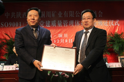 歷經(jīng)8 個月的工作,于12月8日上午,銅川礦業(yè)有限公司委員會黨建工作質(zhì)量管理體系順利通過了北京新世紀(jì)認(rèn)證有限公司現(xiàn)場審定,并取得認(rèn)證書。這是陜西省國有企業(yè)首家取得ISO9000質(zhì)量管理體系認(rèn)證的單位。省國資委黨委副書記、紀(jì)委書記高新華,陜煤化集團(tuán)黨委副書記馬富元、黨群工作部部長夏迎廣及銅川市和銅川礦業(yè)公司相關(guān)領(lǐng)導(dǎo)和人員共160余人參加了認(rèn)證頒證儀式。銅川礦業(yè)公司黨委書記杜樹山主持認(rèn)證頒證儀式。
