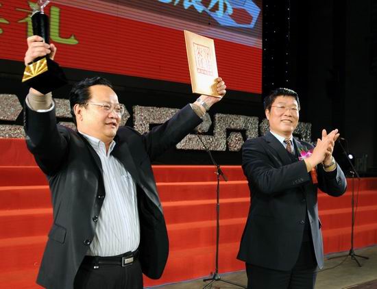 黃陵礦業(yè)公司總經(jīng)理宋老虎接受陜西省企業(yè)文化建設(shè)示范單位獎牌