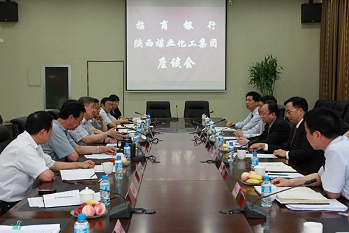 6月12日下午,招商銀行總行副行長(zhǎng)唐志宏、總行公司銀行部總經(jīng)理張建、西安分行行長(zhǎng)王冰劍等一行六人來到陜西煤業(yè)化工集團(tuán)公司,與集團(tuán)公司董事長(zhǎng)、黨委書記華煒,總經(jīng)理高仰才及規(guī)劃委、財(cái)務(wù)資產(chǎn)部、投資公司負(fù)責(zé)人進(jìn)行了座談。