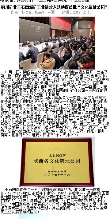 12月11日,陜西省文化遺址公園工作座談會在西安召開,公布了第一批“陜西省文化遺址公園”名單。 此次文化遺址公園申報中,全省共計106家單位參與了申報,25處文化遺址成功入選,包括史前遺址、古都城(宮殿)遺址和帝王陵園、古建筑、古窯址、石窟寺、革命舊址和工業(yè)遺址等。銅川市包括王石凹煤礦、玉華宮遺址、耀州窯遺址三處遺址成功入選,王石凹煤礦也是全省首批唯一入選的煤礦工業(yè)遺址。