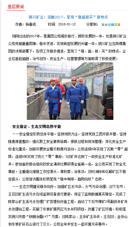 剛剛過去的2017年,是集團(tuán)公司闊步前行、跨躍發(fā)展的一年,也是銅川礦業(yè)公司克服重重困難,穩(wěn)中求進(jìn),實現(xiàn)轉(zhuǎn)型發(fā)展的關(guān)鍵一年。銅川礦業(yè)在陜煤集團(tuán)的決策部署下,各項工作穩(wěn)步推進(jìn),呈現(xiàn)了“穩(wěn)、超、新、實”的特點(diǎn),企業(yè)在追趕超越、治虧創(chuàng)效、安全生產(chǎn)、經(jīng)營管理等方面取得了積極進(jìn)展。
