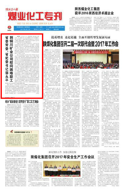 郭永平在聽取匯報(bào)后充分肯定了銅川礦業(yè)公司各項(xiàng)工作取得的成績。他指出,歷史上,銅川礦務(wù)局為銅川地區(qū)、陜西省和國家經(jīng)濟(jì)社會(huì)發(fā)展做出了重要貢獻(xiàn),任何時(shí)候省委省政府都不會(huì)忘記這一點(diǎn)。銅川礦業(yè)公司當(dāng)前面臨的困難是歷史原因和市場(chǎng)原因共同作用的結(jié)果,這既是銅川礦業(yè)公司和陜煤化集團(tuán)的困難,也是省委省政府的困難,大家要樹立信心,一起想辦法解決當(dāng)前面臨的困難。他強(qiáng)調(diào),凡是涉及職工切身利益的問題都是省委省政府關(guān)心和關(guān)注的問題,只要是有政策規(guī)定的,政府就有責(zé)任兜底解決,絕不遺漏任何一名職工。他指出,銅川礦業(yè)公司干部職工面對(duì)困難信心足、精神佳,這說明企業(yè)文化、企業(yè)精神和職工思想政治工作開展得好,要繼續(xù)保持和發(fā)揚(yáng)。他要求,陜煤化集團(tuán)要切實(shí)做好扶貧幫困送溫暖工作,關(guān)心和幫扶礦區(qū)收入偏低職工和困難人員生活,確保他們度過一個(gè)愉快的春節(jié)。銅川礦業(yè)公司在轉(zhuǎn)型發(fā)展中要結(jié)合企業(yè)實(shí)際理清思路,不斷加強(qiáng)改革創(chuàng)新力度,多舉措探索企業(yè)轉(zhuǎn)型發(fā)展途徑,關(guān)心困難職工和群眾生活,團(tuán)結(jié)帶領(lǐng)廣大干部職工艱苦奮斗,勇于擔(dān)當(dāng),為助推企業(yè)轉(zhuǎn)型發(fā)展,促進(jìn)銅川和全省經(jīng)濟(jì)社會(huì)發(fā)展再做新貢獻(xiàn)。