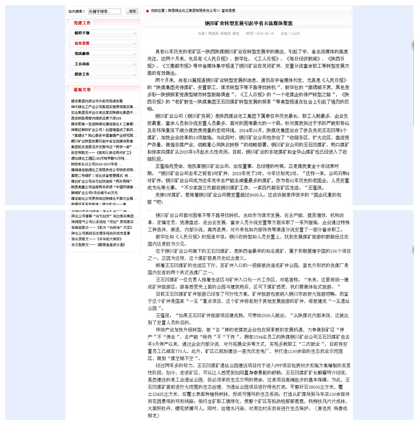 兩個月來,共有15篇報道銅川礦業(yè)轉(zhuǎn)型發(fā)展的消息、通訊在中省媒體刊發(fā),尤其是《人民日報》的“陜煤集團關(guān)停煤礦、安置職工、謀求轉(zhuǎn)型不等不靠尋找轉(zhuǎn)機”,新華社的“煤竭城不衰、黑色變多彩—陜銅探索資源型城市轉(zhuǎn)型新路調(diào)查”,《工人日報》的“一個老煤企的停產(chǎn)轉(zhuǎn)型之路”,《陜西日報》的“老礦新生—陜煤集團王石凹煤礦轉(zhuǎn)型發(fā)展的探索”等典型報道在社會上引起了強烈的反響。