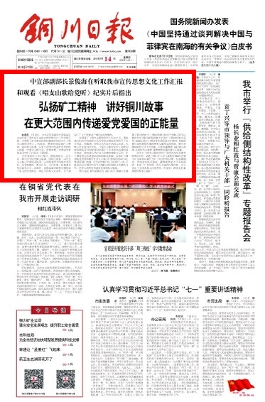 紀(jì)實(shí)片《唱支山歌給黨聽》是我市為慶祝建黨95周年而作,講述了銅川礦工詩人姚筱舟1958年在銅川礦務(wù)局焦坪煤礦當(dāng)?shù)V工時創(chuàng)作的詩歌,經(jīng)雷鋒摘抄、作曲家朱踐耳譜曲、藏族歌唱家才旦卓瑪演唱,形成了廣為傳唱、經(jīng)久不衰的紅歌經(jīng)典,充分表達(dá)了全國各族人民感恩黨、熱愛黨、跟黨走的真摯情懷和衷心擁護(hù)。