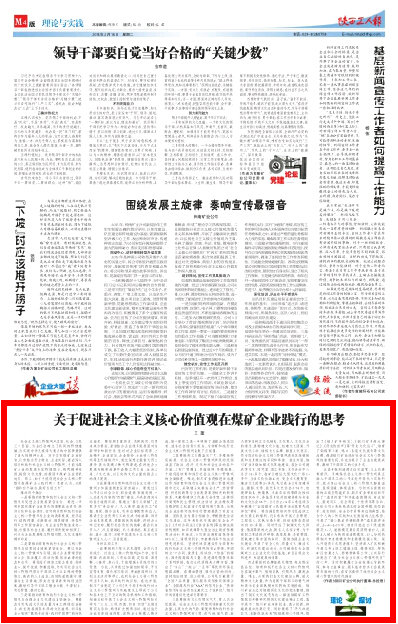 一是要推動(dòng)培育和踐行社會(huì)主義核心價(jià)值觀與促進(jìn)企業(yè)發(fā)展緊密融合。要進(jìn)一步明晰國有煤礦企業(yè)肩負(fù)的重要政治責(zé)任、經(jīng)濟(jì)責(zé)任和社會(huì)責(zé)任,切實(shí)將培育和踐行社會(huì)主義核心價(jià)值觀與企業(yè)的改革發(fā)展、經(jīng)濟(jì)運(yùn)行、結(jié)構(gòu)調(diào)整、創(chuàng)新驅(qū)動(dòng)、提質(zhì)增效、轉(zhuǎn)型升級(jí)等工作緊密融合,與企業(yè)的價(jià)值追求相一致,與服務(wù)社會(huì)發(fā)展,履行職責(zé)使命相照應(yīng),從而為企業(yè)發(fā)展確立價(jià)值引領(lǐng)、文化支撐和精神動(dòng)力。