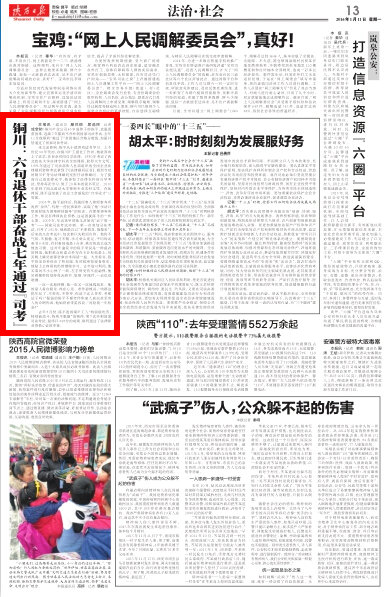 銅川礦業(yè)公司65歲退休干部陳平,克服重重困難,連續(xù)7年鍥而不舍沖刺國(guó)家司法考試,去年12月他順利“越過(guò)了”貧困地區(qū)合格分?jǐn)?shù)線,如愿以償通過(guò)了國(guó)家司法考試。