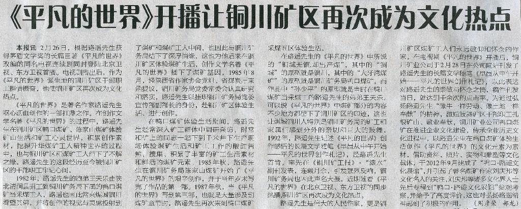 ★ 3月10日“陜西工人報”刊發(fā)《<平凡的世界>開播讓銅川礦區(qū)再次成為文化焦點》(作者:周彥榮 郝龍)
