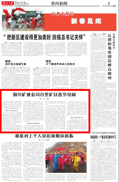 大年初一,陳家山礦的秧歌和扇子舞精彩上演,徐家溝礦的猜謎、舞龍舞獅、劃旱船吸引了職工群眾的駐足觀看,焦坪社區(qū)的拔河、跳繩、套圈等趣味活動(dòng)現(xiàn)場(chǎng)歡聲笑語響徹耳畔。大年初二至初五,下石節(jié)礦職工自編自導(dǎo)自演的新春文藝演出,玉華礦的職工新年越野賽、卡拉OK大賽,柴家溝礦的群眾娛樂活動(dòng),王石凹礦、東坡礦、金華山礦、鴨口礦的社火表演、安全知識(shí)競答等活動(dòng)輪番上演。元宵節(jié),銅川礦區(qū)工會(huì)和該公司各基層單位還將舉辦“和諧礦區(qū)·金羊迎春”鬧元宵節(jié)活動(dòng)。系列文化活動(dòng)的舉辦共同匯集在新春、共同展示在礦山、共同滋潤著職工的心田,也使新年的新憧憬、新夢(mèng)想、新希望在喜慶中匯聚和傳遞,并在放飛夢(mèng)想、走向未來的美好期盼將銅川礦業(yè)轉(zhuǎn)型發(fā)展、二次創(chuàng)業(yè)的奮進(jìn)戰(zhàn)歌唱響礦區(qū),傳遍了千家萬戶。