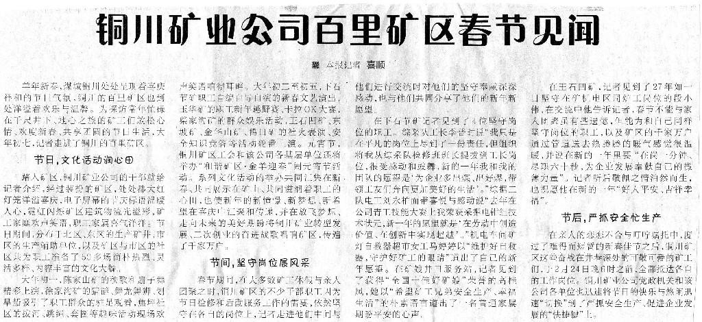 ★ 2月28日“陜西日?qǐng)?bào)”刊發(fā)《銅川礦業(yè)公司百里礦區(qū)春節(jié)見(jiàn)聞》
