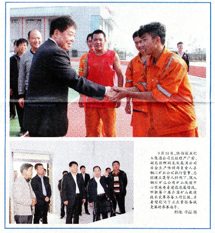 ★9月23日“陜西工人報”刊發(fā)《陜煤化集團(tuán)總經(jīng)理嚴(yán)廣勞深入銅川礦業(yè)公司礦山救援中心調(diào)研指導(dǎo)》(作者:郝龍 李磊)