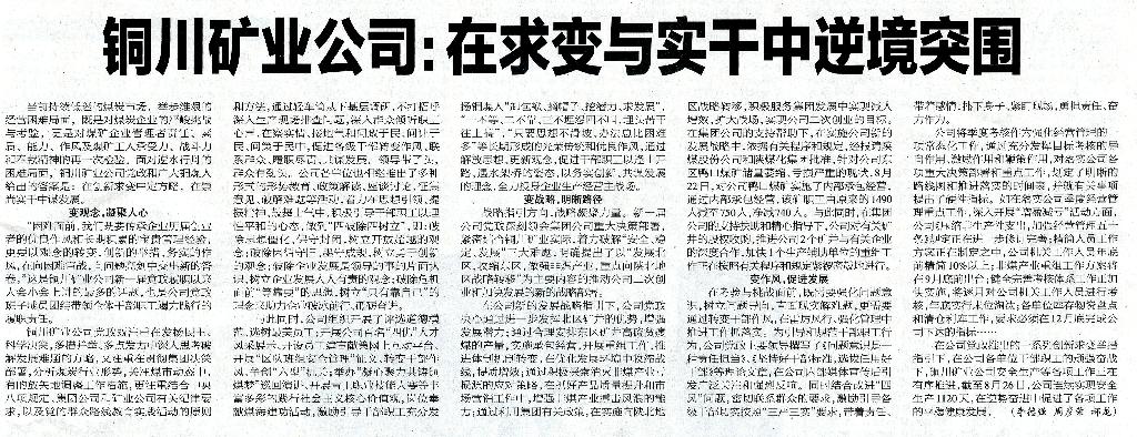 ●9月2日“陜西工人報”頭版頭條刊發(fā)《銅川礦業(yè)公司:在求變與實干中逆境突圍》(作者:李德強(qiáng) 周彥榮 郝龍)