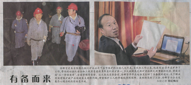 ★ 3月11日“陜西工人報(bào)”刊發(fā)《徐群賢——煤礦一線職工的代言人》(作者:李華)
