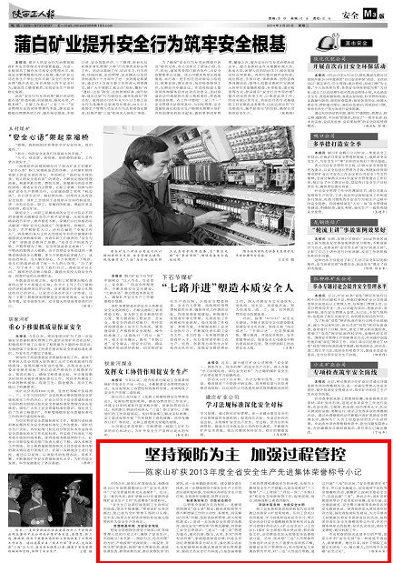 開局之年,陳家山礦喜報(bào)連連,相繼榮獲2013年度陜煤集團(tuán)公司“安全先進(jìn)礦井”、“安全質(zhì)量標(biāo)準(zhǔn)化先進(jìn)煤礦”。近日,又一喜訊傳來,該礦榮摘2013年度陜西省煤礦安全生產(chǎn)工作“先進(jìn)集體”榮譽(yù)稱號(hào)?!鞍踩a(chǎn)這條紅線是職工生命保證的底線,堅(jiān)決不能碰觸?!毙蠌┟竦V長多次提出,現(xiàn)已成為全礦管理干部的口頭禪。近年來,陳家山礦把堅(jiān)持預(yù)防和加強(qiáng)過程管控作為安全生產(chǎn)的保證。