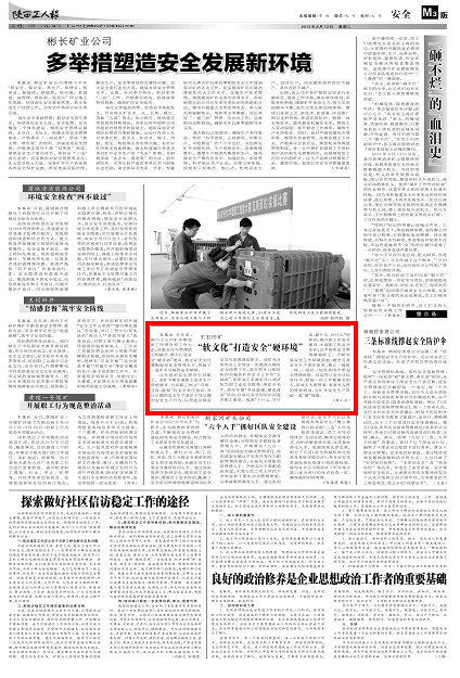 近年來,銅川王石凹礦不斷創(chuàng)新工作理念和工作方法,注重文化與管理的互相融合,著力打造安全“硬環(huán)境”建設(shè),通過安全文化熏陶促進(jìn)安全管理水平,筑起了一道牢不可破的安全屏障。