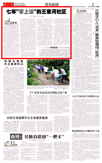 陜西日?qǐng)?bào) 2013年8月9日 第五版 “你看,這社區(qū)的領(lǐng)導(dǎo)真真為咱職工群眾辦成了清潔供暖、飲水改造、道路改造、環(huán)境改造、舊樓改造等數(shù)十件好事、實(shí)事,使俺們能更有尊嚴(yán)、更加體面的生活……這社區(qū)是一心為民、關(guān)注民生、為民辦事、群眾信得過(guò)的和諧大家園,解決了王家河礦區(qū)幾十年想解決而沒(méi)有解決的件件老大難問(wèn)題,我們打心眼里擁護(hù)和愛(ài)戴社區(qū)的好領(lǐng)導(dǎo)。”用王家河社區(qū)住了幾十年的退休職工張大爺?shù)脑?huà)說(shuō),就是“這變化一兩句話(huà)很難說(shuō)清楚,只是這五六年的變化比前20年都快,大家都說(shuō)好。知道不?俺這社區(qū)都連續(xù)7年無(wú)赴省進(jìn)京越級(jí)上訪、集體上訪了……”王家河社區(qū)的前身是下馬的王家河煤礦,管轄王家河一號(hào)井、老礦部、斜井3個(gè)家屬區(qū),跨距5公里;直接管理和服務(wù)離退休人員1078人、工(?。┩鲞z屬297人、上世紀(jì)60年代精簡(jiǎn)下放人員17人、70年代致殘返鄉(xiāng)人員12人、享受養(yǎng)老補(bǔ)貼人員601人、一次性安置人員281人,還有勞動(dòng)服務(wù)公司集體工已退休和未退休198人,以及家屬7200多人。地盤(pán)大了問(wèn)題多,人口多了事也多。面對(duì)一次性安置人員、工(?。┩鲞z屬、退休人員等問(wèn)題,面對(duì)歷史遺留問(wèn)題多、困難群體多等難題。