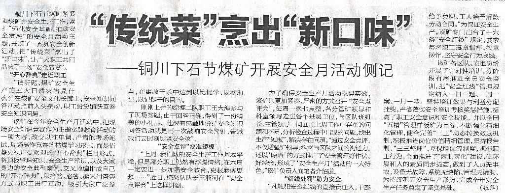 ●6月18日“陜西工人報(bào)”煤業(yè)三版刊發(fā)《“傳統(tǒng)菜”烹出“新口味” --銅川下石節(jié)煤礦開(kāi)展安全月活動(dòng)側(cè)記》(作者:張萍)