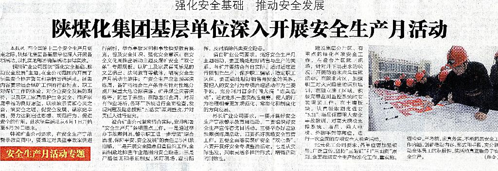 ★ 6月4日“陜西工人報(bào)”刊發(fā)《陜煤化集團(tuán)基層單位深入開(kāi)展安全生產(chǎn)月活動(dòng)》(作者:集團(tuán)綜合報(bào)道)