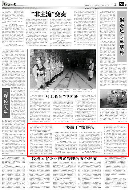 陜西工人報 2013年7月9日 煤業(yè)三版 提到柴振東,大家就會想到他的安全管理三法:“婆婆嘴”、“飛毛腿”、“鐵手腕”。作為銅川鴨口公司綜采一隊檢修班班長,他以獨有的方式履行著崗位職責(zé)。安全管理的“婆婆嘴”