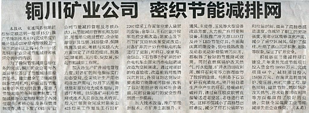 ● 3月12日“陜西工人報”煤業(yè)二版刊發(fā)《銅川礦業(yè)公司密織節(jié)能減排網(wǎng)》(作者:王莉)