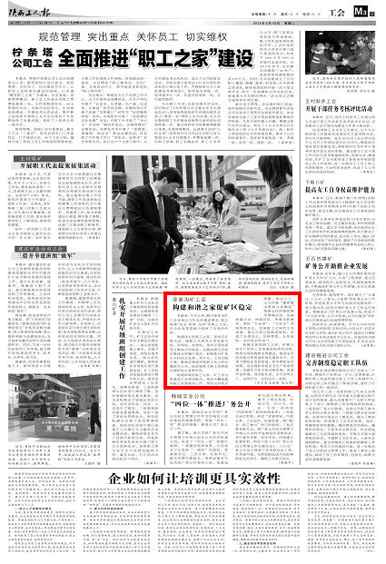 本報(bào)訊今年以來(lái),銅川徐家溝礦工會(huì)堅(jiān)持以人為本的建家理念,努力構(gòu)建“民主、和諧、文明”的職工之家,在企業(yè)改革發(fā)展中發(fā)揮了應(yīng)有的作用。