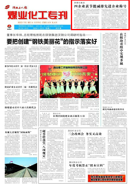 陜西工人報(bào) 2013年元月8日 頭版 近日,從中國(guó)煤炭工業(yè)協(xié)會(huì)和中國(guó)煤炭加工利用協(xié)會(huì)傳來(lái)喜訊,陜煤化集團(tuán)所屬的黃陵礦業(yè)公司、銅川礦業(yè)公司、澄合礦業(yè)公司及陜西中能煤田公司被評(píng)為2010-2011年度煤炭工業(yè)節(jié)能減排先進(jìn)企業(yè)。陜煤化集團(tuán)自成立以來(lái),緊密結(jié)合國(guó)家的產(chǎn)業(yè)政策,堅(jiān)持以科技創(chuàng)新為支撐,遵循“減量化、再利用、再循環(huán)”的原則,通過(guò)老礦區(qū)技術(shù)改造、新礦區(qū)的產(chǎn)能升級(jí),實(shí)現(xiàn)了高產(chǎn)高效開(kāi)采;加大礦井廢水、煤矸石、煤泥、粉煤灰、煤氣層的利用力度,引導(dǎo)下屬企業(yè)由依靠煤炭產(chǎn)量的增長(zhǎng)轉(zhuǎn)到提高煤炭綜合開(kāi)發(fā)利用的質(zhì)量和效益上來(lái),實(shí)現(xiàn)了煤與煤伴生資源的綜合開(kāi)發(fā)、深度加工、清潔利用,發(fā)展生態(tài)煤炭工業(yè)。