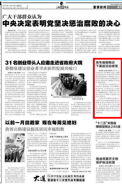 本報訊(張艷芳)昨天早上,為期5天的“青年編輯下基層”主題教育實踐活動結(jié)束,省委宣傳部、省出版集團(tuán)和陜西煤業(yè)化工集團(tuán)銅川礦業(yè)公司的相關(guān)領(lǐng)導(dǎo)與25名青年編輯舉行了座談會,暢談這次主題教育活動的體會、感受和收獲。