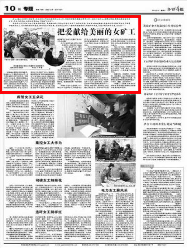 (王 莉 李勝會(huì) 李 浩 鄭珊萍)礦山,被認(rèn)為是男人的世界,而生活和工作在這里的礦山女工們,用她們嬌柔的身軀與男員工們一道戰(zhàn)斗在礦山,拼搏在煤海,默默地奉獻(xiàn)在百里礦區(qū),用自己的青春、熱情和智慧托起了煤?!鞍脒吿臁?。
