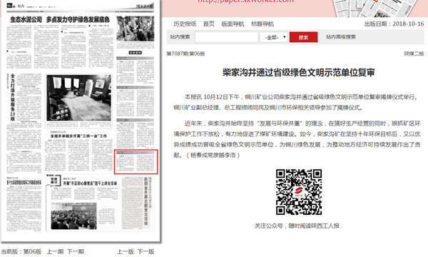 本報訊 10月12日下午,銅川礦業(yè)公司柴家溝井通過省級綠色文明示范單位復(fù)審揭牌儀式舉行。銅川礦業(yè)副總經(jīng)理、總工程師師同民及銅川市環(huán)保相關(guān)領(lǐng)導(dǎo)參加了揭牌儀式。