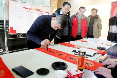 為迎接新春佳節(jié)的到來,營造歡樂喜慶、溫馨和諧的節(jié)日氣氛,1月25日,陜北礦業(yè)公司工會(huì)邀請(qǐng)陜西省總工會(huì)副巡視員、原陜西省能源化工地質(zhì)工會(huì)主席薛躍,同公司機(jī)關(guān)的書法愛好者一道為干部職工寫春聯(lián),送上一份誠摯的新春祝福。(鄭欽月 攝)