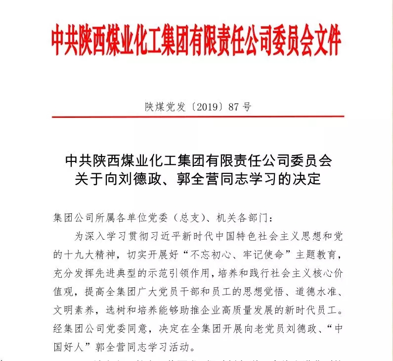 近日,陜煤集團(tuán)黨委印發(fā)文件,在全集團(tuán)范圍內(nèi)開展向老黨員劉德政、“中國好人”郭全營同志學(xué)習(xí)活動。文件指出,劉德政同志一輩子初心不改、本色不變,是共產(chǎn)黨員的楷模。學(xué)習(xí)劉德政同志,就是要學(xué)習(xí)他淡泊名利、矢志奉獻(xiàn)的精神,學(xué)習(xí)他堅守初心、不忘本色的高尚情操。郭全營同志一直以來急公好義、樂于助人,是陜煤員工的榜樣。學(xué)習(xí)郭全營同志,就是要學(xué)習(xí)他無私奉獻(xiàn)、向上向善的好人精神,學(xué)習(xí)他見義勇為、扶危濟(jì)困的最美品德。