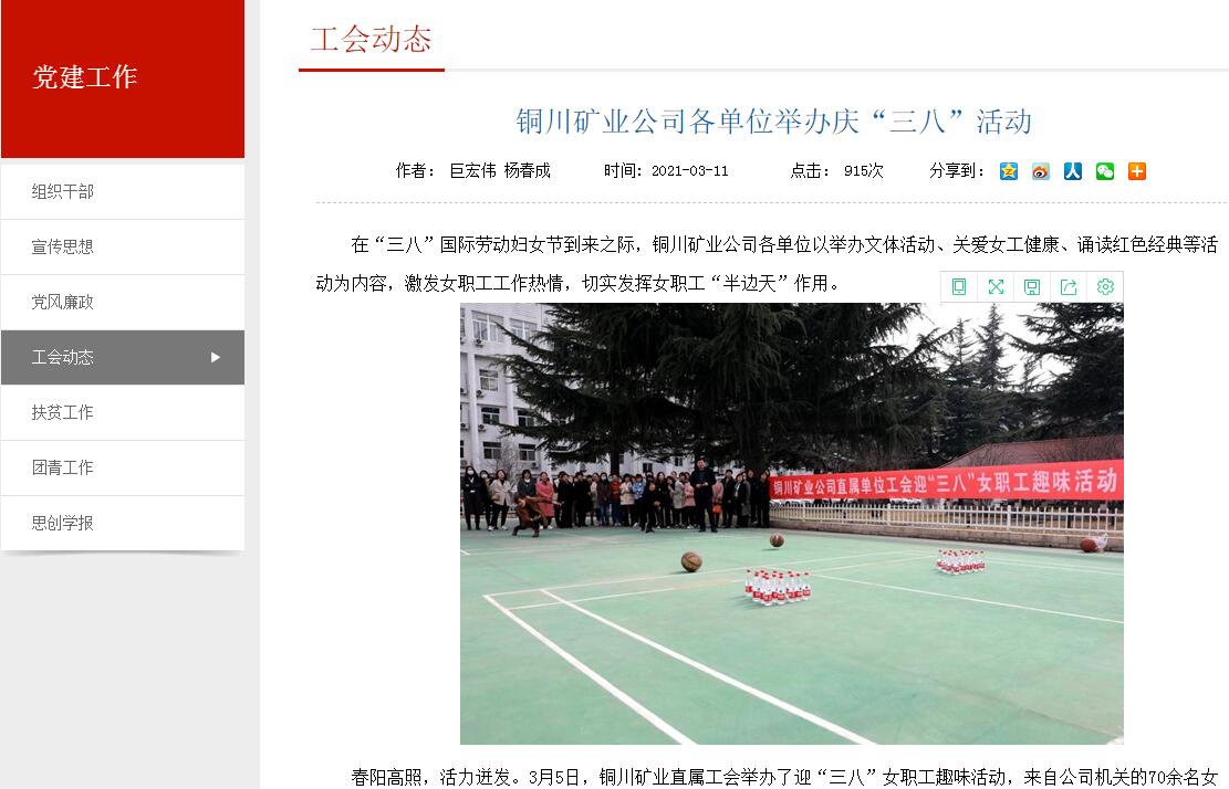 在“三八”國(guó)際勞動(dòng)?jì)D女節(jié)到來(lái)之際,銅川礦業(yè)公司各單位以舉辦文體活動(dòng)、關(guān)愛(ài)女工健康、誦讀紅色經(jīng)典等活動(dòng)為內(nèi)容,激發(fā)女職工工作熱情,切實(shí)發(fā)揮女職工“半邊天”作用。