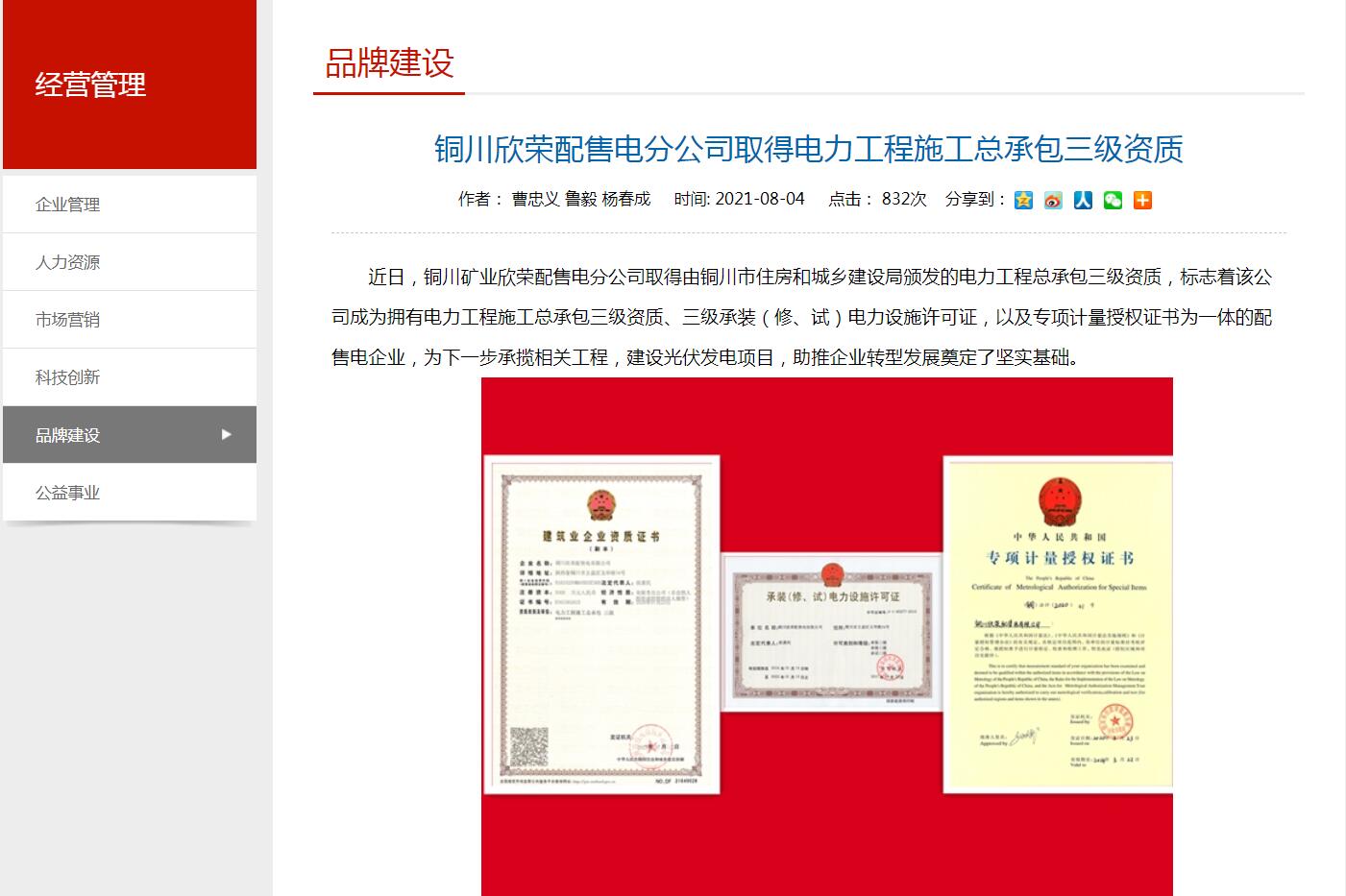 近日,銅川礦業(yè)欣榮配售電分公司取得由銅川市住房和城鄉(xiāng)建設局頒發(fā)的電力工程總承包三級資質(zhì),標志著該公司成為擁有電力工程施工總承包三級資質(zhì)、三級承裝(修、試)電力設施許可證,以及專項計量授權(quán)證書為一體的配售電企業(yè),為下一步承攬相關(guān)工程,建設光伏發(fā)電項目,助推企業(yè)轉(zhuǎn)型發(fā)展奠定了堅實基礎。