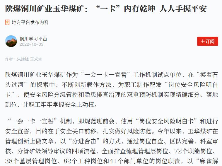陜煤銅川礦業(yè)玉華煤礦作為“一會(huì)一卡一宣誓”工作機(jī)制試點(diǎn)單位,在“摸著石頭過(guò)河”的探索中,不斷創(chuàng)新載體方法,為職工制作配發(fā)“崗位安全風(fēng)險(xiǎn)明白卡”,使安全風(fēng)險(xiǎn)分級(jí)管控和隱患排查治理的雙重預(yù)防機(jī)制實(shí)現(xiàn)精確細(xì)分、落地到位,讓職工牢牢掌握安全主動(dòng)權(quán)。