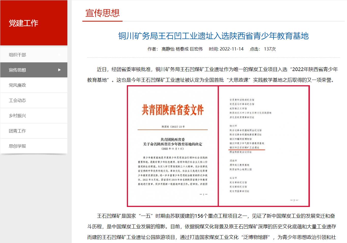 近日,經團省委審核批準,銅川礦務局王石凹煤礦工業(yè)遺址作為唯一的煤炭工業(yè)項目入選“2022年陜西省青少年教育基地”。這也是今年王石凹煤礦工業(yè)遺址被認定為全國首批“大思政課”實踐教學基地之后取得的又一項榮譽。