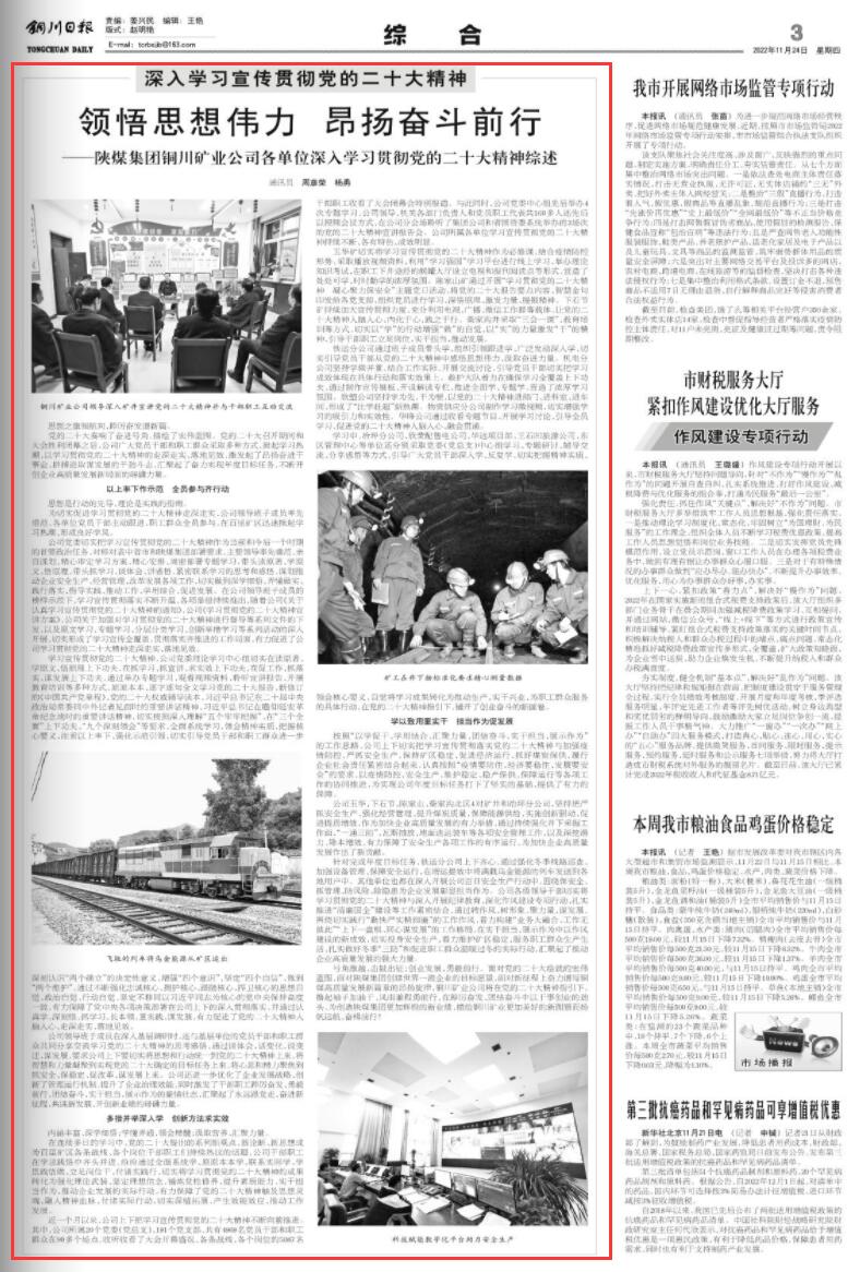 玉華礦切實(shí)將學(xué)習(xí)宣傳貫徹黨的二十大精神作為必修課,結(jié)合疫情防控形勢(shì),采取播放視頻資料、利用“學(xué)習(xí)強(qiáng)國”學(xué)習(xí)平臺(tái)進(jìn)行線上學(xué)習(xí)、舉辦理論知識(shí)考試、在職工下井途經(jīng)的候罐大廳設(shè)立電視和報(bào)刊閱讀點(diǎn)等形式,營造了處處可學(xué)、時(shí)時(shí)勤學(xué)的濃厚氛圍。陳家山礦通過開展“學(xué)習(xí)貫徹黨的二十大精神 凝心聚力保安全”主題黨日活動(dòng),將黨的二十大報(bào)告要點(diǎn)內(nèi)容、智慧金句印發(fā)給各黨支部,組織黨員進(jìn)行學(xué)習(xí)、深悟原理、激發(fā)力量、提振精神。下石節(jié)礦持續(xù)加大宣傳貫徹力度,充分利用電視、廣播、微信工作群等載體,讓黨的二十大精神入腦入心、內(nèi)化于心、踐之于行。柴家溝井采取“三會(huì)一課”、教育培訓(xùn)等方式,切實(shí)以“學(xué)”的行動(dòng)增強(qiáng)“做”的自覺、以“實(shí)”的力量激發(fā)“干”的精神,引導(dǎo)干部職工立足崗位、實(shí)干擔(dān)當(dāng)、推動(dòng)發(fā)展。