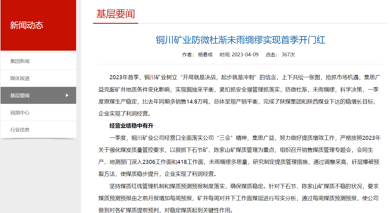 一季度,銅川礦業(yè)公司經營口全面落實公司“三會”精神,集思廣益,努力做好提質增效工作,嚴格按照2023年關于強化煤炭質量管控要求,以狠抓下石節(jié)礦、陳家山礦煤質管理為重點,組織召開銷售煤質管理專題會,會同生產、地測部門深入2306工作面和418工作面,未雨綢繆多思量,研究制定提質管理措施,通過調整采高、矸層爆破預裂方法,使煤質穩(wěn)步提升,企業(yè)實現了利潤經營。
