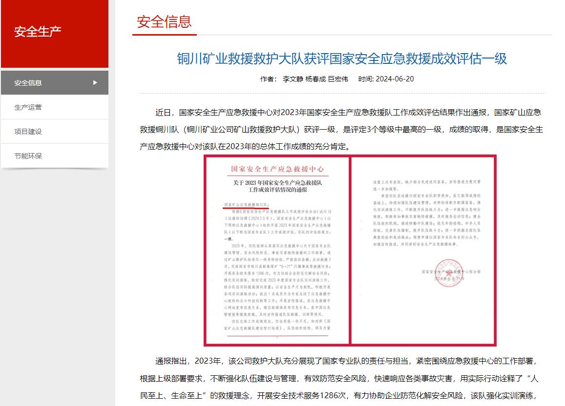 近日,國家安全生產(chǎn)應(yīng)急救援中心對2023年國家安全生產(chǎn)應(yīng)急救援隊工作成效評估結(jié)果作出通報,國家礦山應(yīng)急救援銅川隊(銅川礦業(yè)公司礦山救援救護大隊)獲評一級,是評定3個等級中最高的一級,成績的取得,是國家安全生產(chǎn)應(yīng)急救援中心對該隊在2023年的總體工作成績的充分肯定。