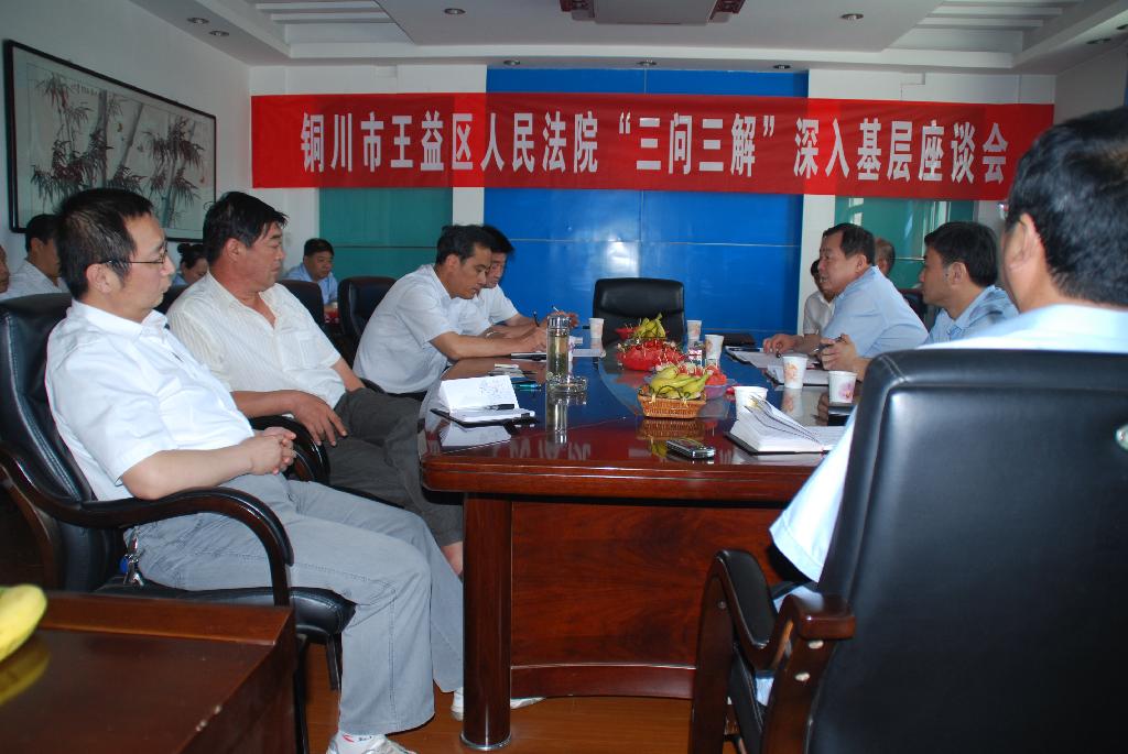 5月30日銅川市王益區(qū)人民法院院長吳玉亭一行10余人,深入多經(jīng)公司,就“三解三問”活動交流座談,多經(jīng)公司黨政領(lǐng)導(dǎo)、全體管理干部參加了座談。
