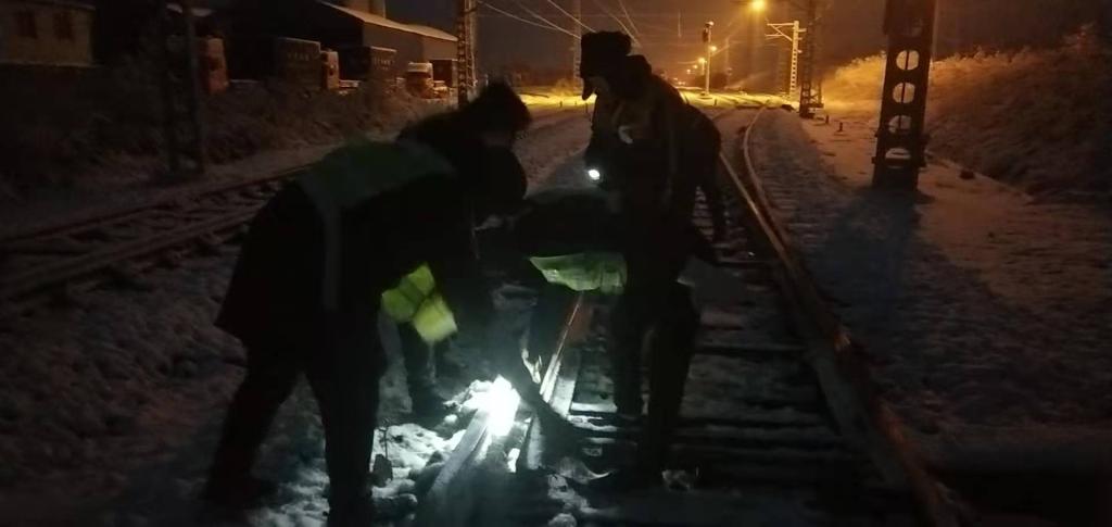21日凌晨2:00,工電車間主任下達指令,各工區(qū)迅速組織工電人員拿著鐵锨、防凍液、吹雪機等除雪工具,對孟家壕車站、化工南車站、液化廠車站、轉(zhuǎn)水廟車站道岔進行掃雪作業(yè)。分別于2點和7點進行掃雪?!把┚褪敲?,無論是白天還是黑夜,雪不停、掃不止。”經(jīng)過作業(yè)人員的奮戰(zhàn),榆橫項目部管內(nèi)共出