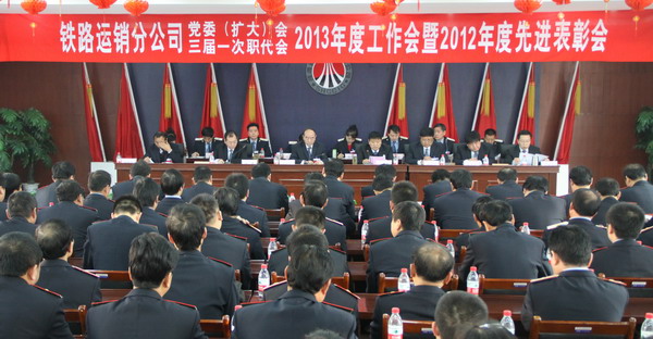 1月23日,鐵路運銷分公司黨委(擴大)會、三屆一次職代會、2013年度工作會暨2012年度先進表彰會在分公司二樓會議室勝利召開,分公司副總以上領(lǐng)導(dǎo)、機關(guān)部門負責人、基層單位領(lǐng)導(dǎo)、職工代表共計130余人參加了會議。