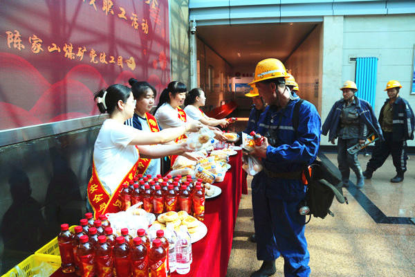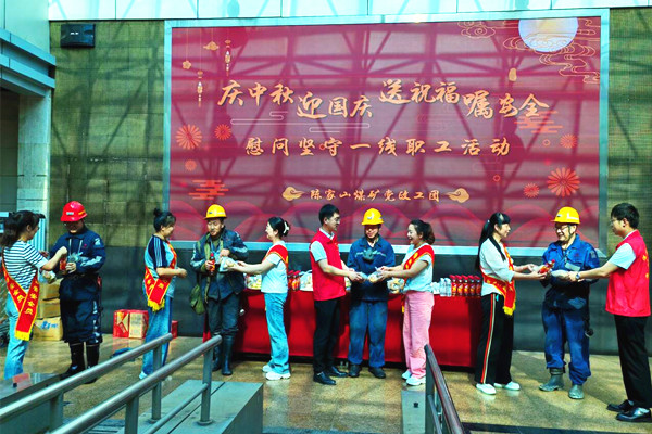 “中秋節(jié)快樂,井下工作時(shí)注意安全!”“節(jié)日快樂,祝你工作順利,闔家團(tuán)圓!”伴隨著一句句祝福,女工協(xié)管員們、團(tuán)員青年志愿者把象征著團(tuán)圓的月餅、面包、雞蛋、冰紅茶等節(jié)日慰問品送到了職工們手中,叮囑他們要按章操作,安全生產(chǎn)。
