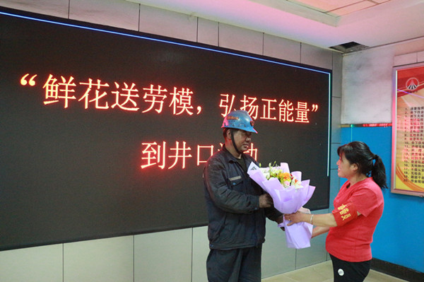 “師傅,您辛苦了!我代表職工家屬感謝您一直以來的辛勤工作,祝您工作順利,健康平安。”女工協(xié)管員一邊對入井人員進(jìn)行安全叮囑,一邊遞上了鮮花。