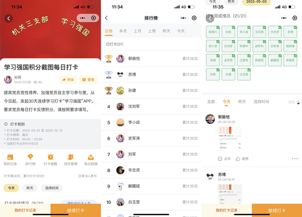 該礦機(jī)關(guān)三支部針對部門和黨員較多,且地面和井工任務(wù)較重,開展集中學(xué)習(xí)受影響的實(shí)際情況,把當(dāng)前開展理論學(xué)習(xí)的重點(diǎn)放在了學(xué)習(xí)強(qiáng)國上,并在督促考核方面“想點(diǎn)子、做文章”,確保黨員干部堅(jiān)持線上學(xué)習(xí)、樂于學(xué)習(xí)、學(xué)有所獲。經(jīng)過一番嘗試,發(fā)現(xiàn)“接龍管家”具備學(xué)習(xí)監(jiān)督督促功能,于是自4月1日開始嘗試運(yùn)用APP做好黨員學(xué)習(xí)教育工作。一個(gè)多月下來,效果立竿見影。 該支部通過“接龍管家”—“愛國學(xué)習(xí)”模塊中學(xué)習(xí)強(qiáng)國完成情況統(tǒng)計(jì)功能,將支部黨員納入統(tǒng)計(jì)范圍,每名黨員匯報(bào)學(xué)習(xí)完成情況,每天完成“打卡記錄”。支部書記根據(jù)反饋情況點(diǎn)評學(xué)習(xí),剖析共性問題,“一對一”指導(dǎo)個(gè)性問題進(jìn)行查弱補(bǔ)強(qiáng)。同時(shí)在模塊中建立學(xué)習(xí)排行榜,發(fā)揮出相互監(jiān)督作用,凸顯線上時(shí)時(shí)監(jiān)督的功能,使后進(jìn)對標(biāo)先進(jìn)趕超有動(dòng)力,先進(jìn)保持領(lǐng)先有壓力。