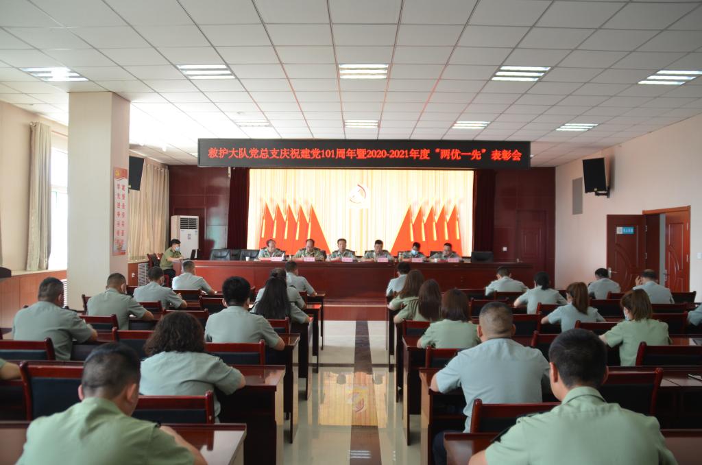 6月27日,救護(hù)大隊(duì)黨總支召開慶祝建黨101周年暨2020-2021年度“兩優(yōu)一先”表彰大會,救護(hù)大隊(duì)班子成員、黨總支委員、各支部黨員及受表彰的先進(jìn)集體和個人共60余人參加會議。
