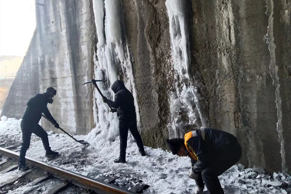 近日,柴家溝井儲(chǔ)煤場(chǎng)黨支部組織黨員化身打冰人,清理煤臺(tái)鐵路煤炭運(yùn)輸窯洞段隧道內(nèi)的冰柱,為鐵路運(yùn)輸保駕護(hù)航。