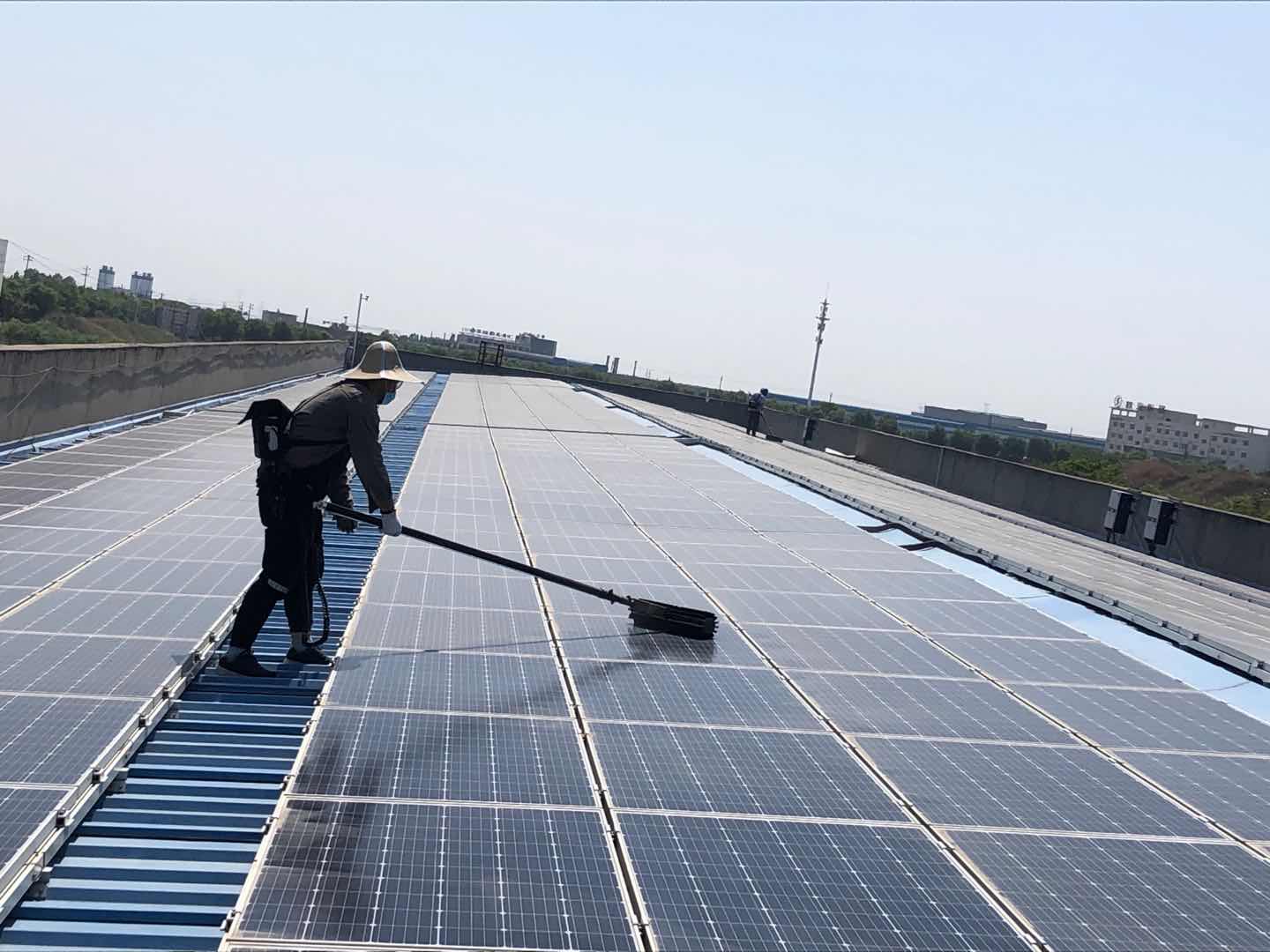 欣榮公司新區(qū)6MWp分布式光伏發(fā)電站,光伏板數(shù)量總計達20868塊,大都分布在屋頂。人工清掃難度大、工作量重。為安全、高效地完成光伏板清潔除塵任務,公司根據(jù)現(xiàn)場實際情況,特制定清掃方案,并對團員青年清掃隊伍進行了風險預控和安全技術交底工作,保證團員青年清掃隊伍的人身及設備安全。團員青年克服困難,認真仔細并耐心清掃,在一次次揮汗下,歷時兩天順利完成光伏清掃工作。