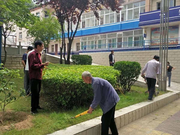 8日一大早,灑水車沿礦區(qū)公路進行灑水降塵。黨委中心組學(xué)習結(jié)束后,全礦黨員自帶拖把、掃帚、抹布、水桶在辦公樓樓道、走廊打掃室內(nèi)外衛(wèi)生;有的自費買來洗衣粉、洗潔凈擦玻璃;有的拿起掃帚打掃地面、有的拿著毛巾清理墻壁、擦拭宣傳櫥窗;有的拿起水桶,一桶一桶地來回打水;有的在花園里撿拾樹葉;有剪花修枝一技之長的黨員修剪花草樹木;有的推著草坪機割草;大家拉開距離,默默地干著各自的活,沒有語言、沒有吵鬧聲,大家忙碌的身影成為礦區(qū)一道亮麗的風景線。