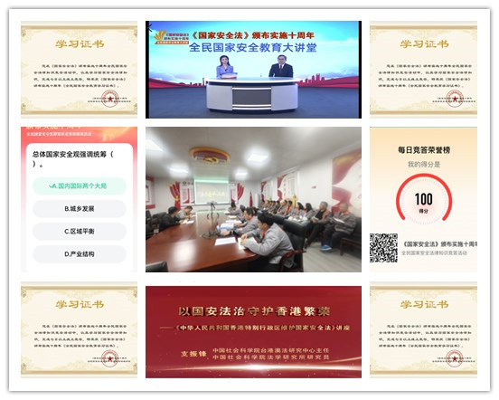 為深入學習領(lǐng)會習近平法治思想的重大意義、豐富內(nèi)涵、精神實質(zhì)和實踐要求,大力學習宣傳總體國家安全觀,該中心明確學習內(nèi)容,緊扣“全民國家安全教育 走深走實十周年”主題,圍繞總體國家安全觀有關(guān)內(nèi)容,以觀看講座、線上答題和朗讀相結(jié)合,引導廣大職工通過掃描活動二維碼,直接進入答題環(huán)節(jié)參與只是競答和朗讀活動,堅持每日觀看一個講座片段、答一份競賽試題,堅持每日朗讀一個法條段落。全體參與活動人員均獲得《2025年全民國家安全教育學習證書》。